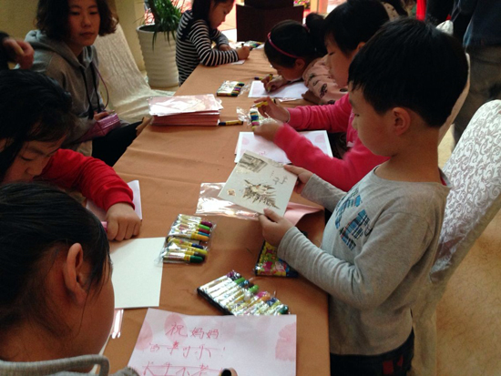 妈妈在忙着观摩蛋糕的制作流程,现场的小朋友们也都没有闲着,他们要送妈妈一份自己亲手做的礼物,就是漂亮的DIY贺卡。小朋友们拿着卡片和五颜六色的彩笔,要把最美好的祝福送给自己的妈妈呢。