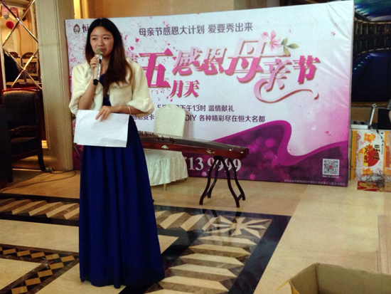 在《感恩的心》、《世上只有妈妈好》等感人心弦的歌声中,在在场人员的欢声笑语中,在康乃馨美妙的花香中,恒大名都“温情五月天,感恩母亲节”活动伴随着主持人甜美的声音缓缓拉开了序幕。
