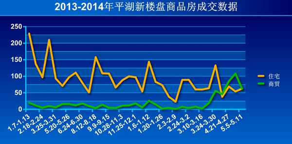 本周开启5月第二周,总成交125套,环比减少23%。住宅成交方面相差无几,主要是商贸锐减。2014年的3月、4月商贸成交量势头强劲,一周基本要五六十套,多的甚至上百套。本周成交62套虽然环比降幅较大,但依然处于高位。