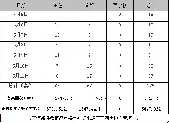 据平湖房产网统计,本周平湖共成交商品房约125套,其中普通住宅的成交量为63套,商贸的成交量为62套。 总成交量相比上周减少37套,其中住宅增加9套,商贸减少46套。
