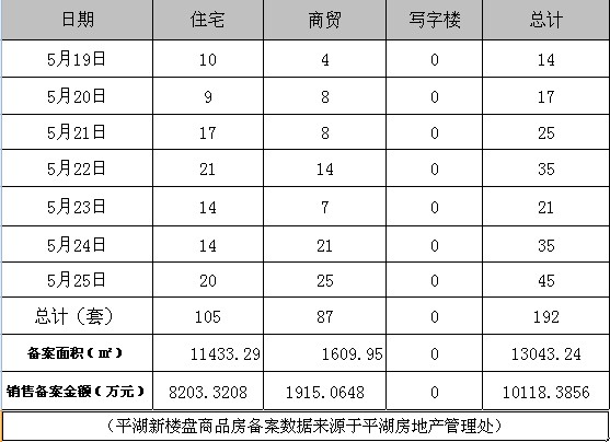 据平湖房产网统计,本周平湖共成交商品房约192套,其中普通住宅的成交量为105套,商贸的成交量为87套。 总成交量相比上周增加71套,其中住宅增加63套,商贸增加8套。