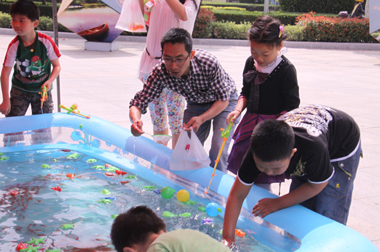 上午九点,亲子垂钓活动正式开始了。广场上,工作人员早已为大家准备好了遮阳棚和装满金鱼的蓝色大池子。小朋友们在看到金鱼后,拍着手又叫又跳,兴奋不已。只见爸爸妈妈们领着他们的小宝宝,撸起袖子,一手拿着小网兜,一手拿着小钓竿,看这架势,是要大显身手啊。