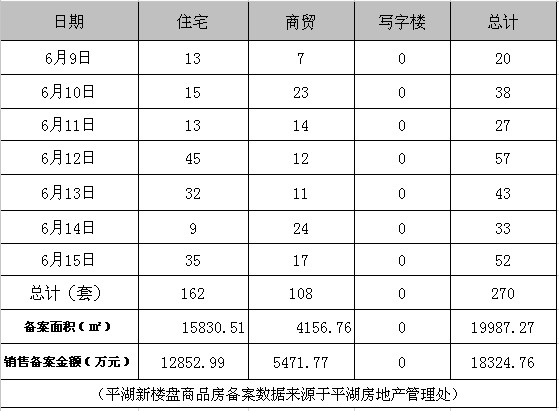 据平湖房产网统计,本周平湖共成交商品房约270套,其中普通住宅的成交量为162套,商贸的成交量为108套。 总成交量相比上周增加92套,其中住宅增加115套,商贸减少23套。