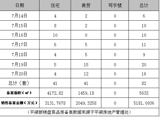 据平湖房产网统计,本周平湖共成交商品房约82套,其中普通住宅的成交量为41套,商贸的成交量为41套。 总成交量相比上周减少14套,其中住宅增加1套,商贸减少15套。