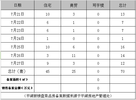 据平湖房产网统计,本周平湖共成交商品房约70套,其中普通住宅的成交量为45套,商贸的成交量为25套。 总成交量相比上周减少12套,其中住宅增加4套,商贸减少16套。