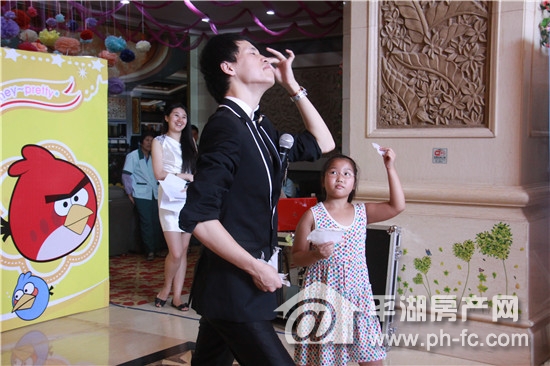 游戏玩累了,那就来品品茶点,看魔术师来表演神奇的魔术吧。一块方巾能做什么,魔术师可是有办法让它由一块变成两块、两块变成三块,而且颜色各不相同哦。接下来,魔术师邀请台下的一位小朋友上台学习魔术,两人搞怪的动作,有趣的对话,让台下笑声不断。这么长时间以来,恒大一直将欢乐带给平湖的业主朋友们,本周依然如此。