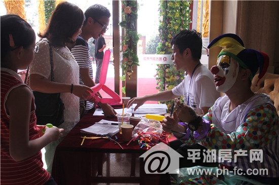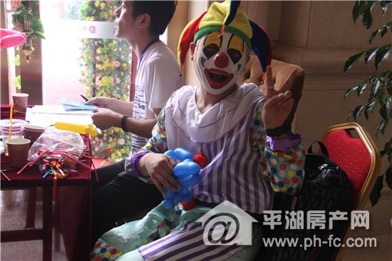 除此之外,现场还有小丑为比赛活跃气氛。这可是一位心灵手巧的小丑哦,五颜六色、形态各异的气球在小丑的巧手之下,一下子就变成了栩栩如生的小动物。而这些可爱的小玩具也都变成了观众们加油鼓劲的道具。