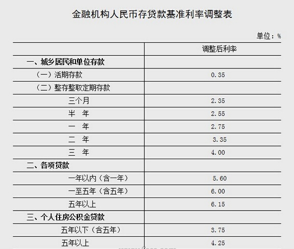 据中国人民银行网站消息,中国人民银行决定,自2014年11月22日起下调金融机构人民币贷款和存款基准利率。金融机构一年期贷款基准利率下调0.4个百分点至5.6%;一年期存款基准利率下调0.25个百分点至2.75%,同时结合推进利率市场化改革,将金融机构存款利率浮动区间的上限由存款基准利率的1.1倍调整为1.2倍;其他各档次贷款和存款基准利率相应调整,并对基准利率期限档次作适当简并。