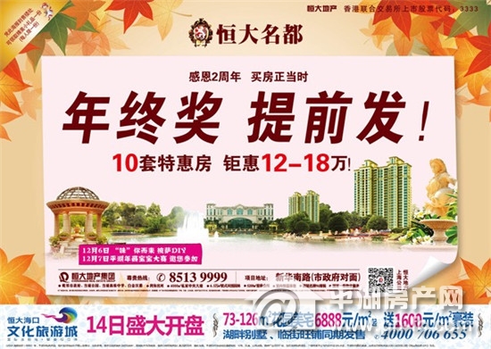 高品质学府,双湖景豪宅。恒大名都新品“镜湖”1号荣耀加推,热销全城。89-139平米瞰景美居,首付5万起即可拎包入住,更送1500元/平米豪装!感恩2周年,买房正当时,10套特惠房,钜慧12-18万!恒大名都满屋名牌、品质保证,省时省心又省钱。