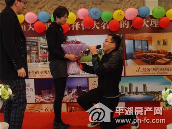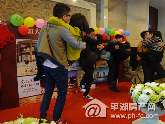 现场送玫瑰花束,把全场一份推到了高潮!玫瑰花人人都喜欢,想拿到可没那么容易。游戏要求男朋友把自己的女朋友公主抱,嘴对嘴,随之准备做深蹲、单脚站立。一开始大家都很稳稳把自己的女朋友把在怀中,到单脚站立时,就倒了一片,现场只有一位男士稳稳地站到了最后,真是值得拍手鼓励。