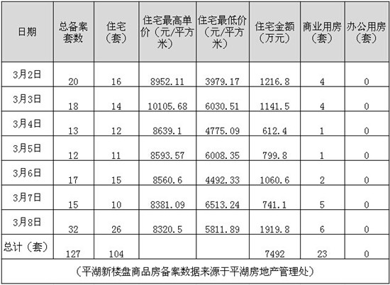 据平湖房产网统计,本周平湖共成交商品房约127套,其中普通住宅的成交量为104套,商贸的成交量为23套,写字楼无成交。 总成交量相比上周增加44套,其中商贸减少了4套,住宅增加了48套。