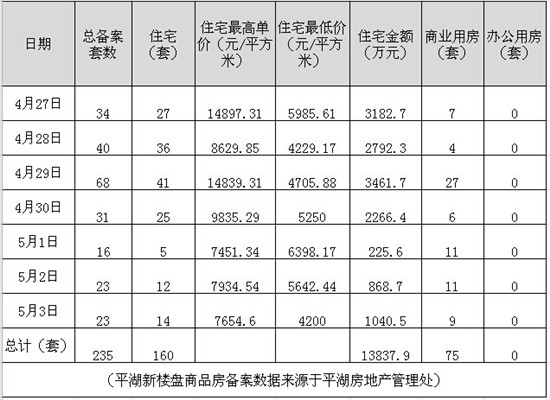再从成交走势来看,总体波动比较明显。上周成交峰值出现在周三(4月29日),当天成交68套,峰谷出现在周五(5月1日),当天分别仅成交16套。上周每日均成交约33套。 而从住宅成交日单价来看,上周的住宅成交单价跨度明显,住宅***单价出现在4月27日(周一),4月29日(周二),为14897.31元/㎡,日***单价出现在5月3日(周日),为4200元/㎡,相差了10697.31元/㎡。