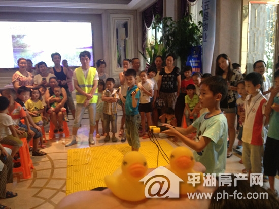 瓜雕完的小朋友们立马被工作人员铺的指压板所吸引,不错,跑男掀起的全民风,想起明星们在指压板上表情各异的神态,不禁都想来尝试一把!当然我们的活动是指压板跳绳比赛,只要能坚持12个跳绳,就送小黄鸭一只,别看人小,各各都是精英!轻松23个没问题!厉害!傍晚时分更有水上步行球,手摇船等水上交通工具,一番水上大作战看来即将上演,看来夏天和水上游乐更配哦!