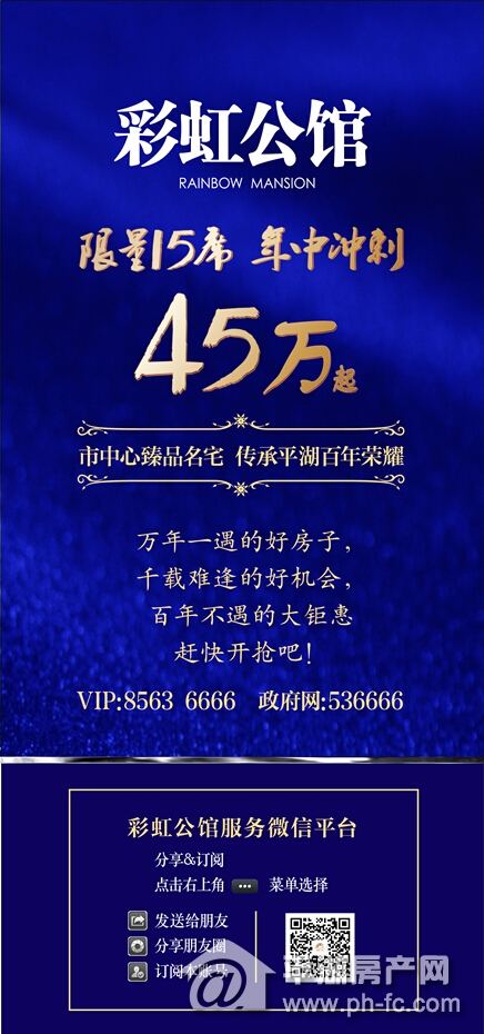 抢住中心、赢得未来!彩虹公馆,拥揽东湖极致美景,私享市中心6万方购物中心奢华配套,85—143㎡定制华宅,重铸平湖住宅新标杆。彩虹公馆年中冲刺,45万起住市中心好房,钜惠不容错过!