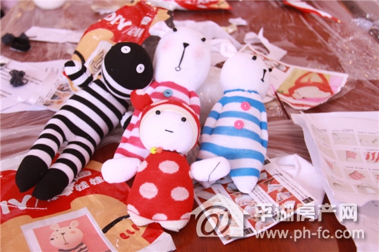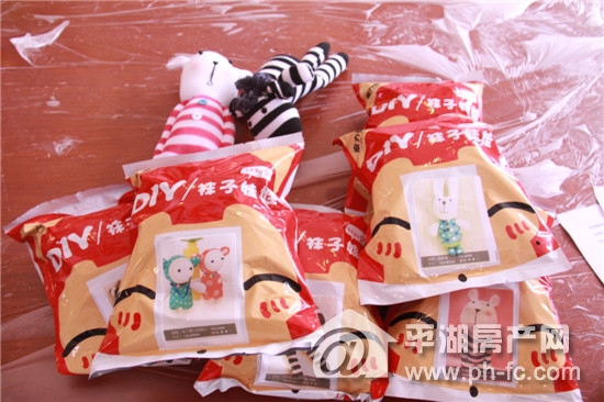 对,制作材料就是这一包包红色包装,里面有线、有袜子、有纽扣等物料,不同的包装袋有印有图案——“毛毛斑马”、“兔哥”、“雪人娃娃”等,不同的袜子娃娃难度程度是不同的,不过,大家首次尝试心中可没底,就拣自己喜欢的图案了。