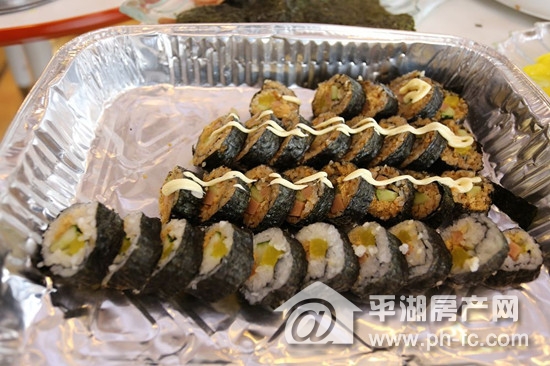 当大家玩的不可开交时,寿司diy也如火如荼的进行着,空闲的妈妈们也一起来动手为宝贝制作一份美食,“来,张嘴,妈妈刚学的寿司,好看不?”“嗯,好吃!”“好,回家也给你做,宝贝加油玩哦!”