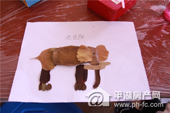当然,今天不做书签,而是树叶贴画。对于小朋友而言,难度系数也不高。各种形状的干树叶都是现成的,你只要选择自己喜欢的图画样本,用双面胶照着贴画就行。半小时不到,几乎每位小朋友完成一个贴画作品。来,展示一下,大象好可爱。