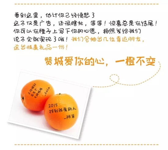 五颜六色的礼盒里满载着一份份“橙意”,等待着去街上和企业里遇见属于自己的主人,送上自己的甘甜,完成食物最伟大的使命。当然,更是代表着赞城在2015年的年末对大家的祝福:心想事橙,橙家立业,梦想成橙。