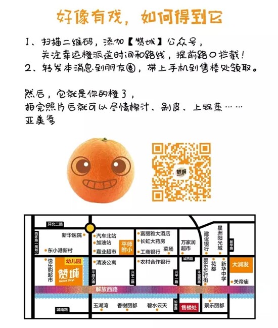 在大润发、解放西路、关帝庙和东湖的街头上看着人人一手提着我们的小礼盒,脸上洋溢着笑容,一份意外的橙子却带了愉悦的心情,不少路人看了礼盒里的名片更是转身过来,咨询置业顾问,更是把自己的手机号码留下,相约周末与家人一起来看看。