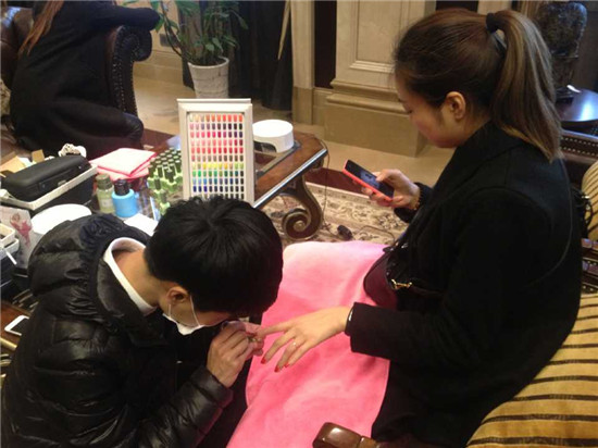 各色鲜艳的指甲油,美甲工具和贴膜用的材料,在专业的美甲师手中,为您量身打造各种美丽闪亮的指甲。修剪指甲、处理死皮、抛光、涂指甲,风干……一系列流程下来,还真是费了一番功夫。但是“功夫不负有心人”,经过漫长的等待与美甲过程,一双双的玉手让美丽的指甲衬托地更加美丽,真的是不虚此行。