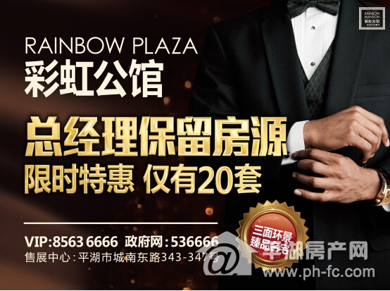 彩虹公馆最新消息:彩虹公馆开盘至今持续热销;现有20套优质保留房源,限时特惠,总经理倾力推荐,三面环景臻品名宅,数量有限,预购从速!