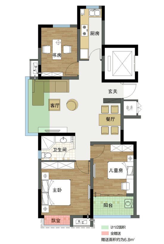 拓展空间/额外约6.8㎡不计面积,相当于一个房间免费