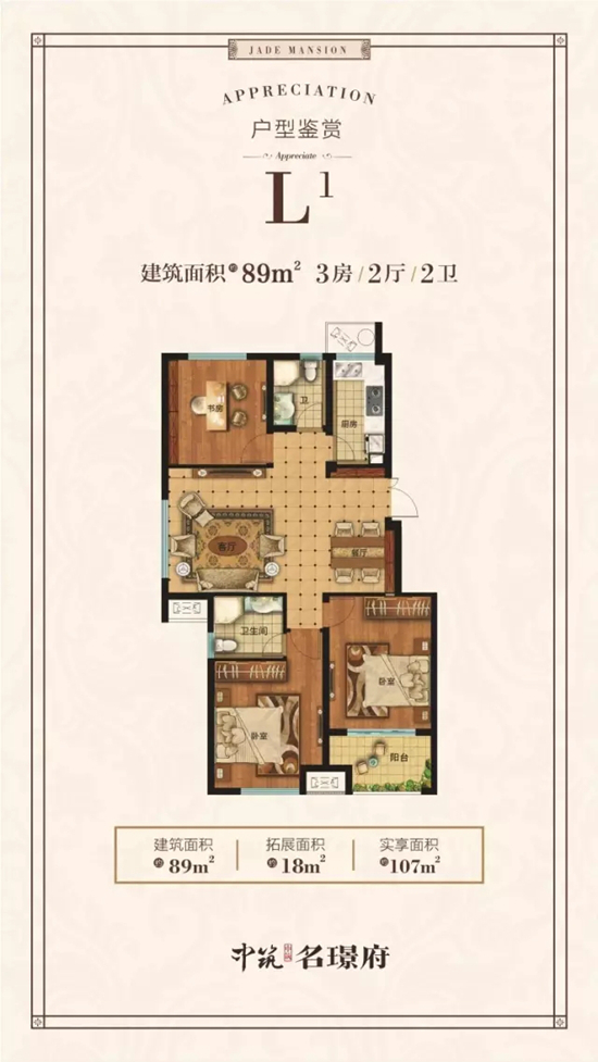 虽然名璟府L1户型只有89㎡左右,但因为产品精心打造,附加值很高,拓展空间合理利用,故89㎡空间舒适性媲美105-110㎡左右的大三房产品。