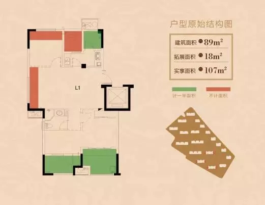 红色部分不计面积,绿色部分计一半面积;实用拓展空间,超高附加值,就是为客户省钱!