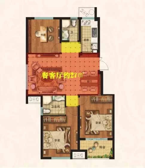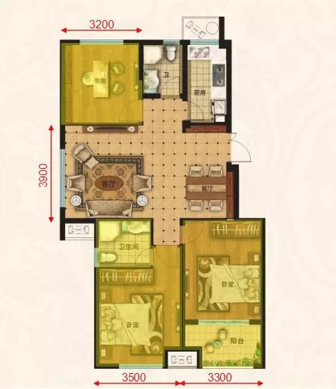 客厅约3.9米、主卧约3.5米、次卧约3.3米,书房约3.2米;大卧室/大餐厅/大客厅;