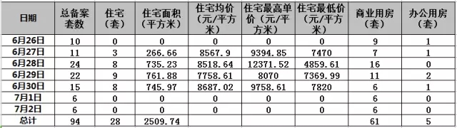 上周商品房备案总套数为94套,其中住宅28套,商业61套,办公5套;住宅备案均价8383.04元/㎡,备案***单价12371.52元/㎡,***4859.61元/㎡。由于目前受备案限价影响,备案均价实则要低于实际成交价。