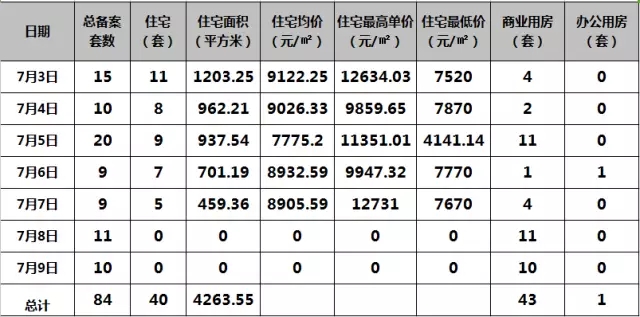 上周商品房备案总套数为84套,其中住宅40套,商业43套,办公1套;住宅备案均价8752.39元/㎡,备案***均价12634.03元/㎡,***4141.14元/㎡,从表格中我们可以看出本周住宅套数和商业用房出现持平状态,这主要和近期商铺活动的火热举行有关,促进了商业用房的成交。