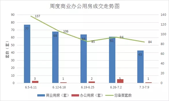 从两种物业来看,本周成交备案以商业为主,占整体整交量的51%,商业较上周环比下降29.5%;办公市场一直低位运行,本周成交量为1套,较上周环比下降80%,主要是目前办公类产品供需均稀少。