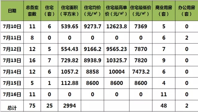 上周商品房备案总套数为75套,其中住宅25套,商业48套,办公2套;住宅备案均价8967.36元/㎡,备案***均价12623.8元/㎡,***7369元/㎡,从表格中我们可以看出本周住宅套数明显少于商铺成交数,这主要和近期商铺活动的火热举行有关,促进了商业用房的成交。