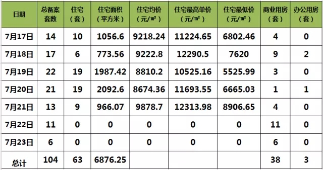 上周商品房备案总套数为104套,其中住宅63套,商业38套,办公3套;住宅备案均价9160.86元/㎡,备案***均价12313.98元/㎡,***5525.99元/㎡,从表格中我们可以看出本周住宅套数明显高于商业成交套数,这主要是因为近期有三个楼盘进行预售证的发放。