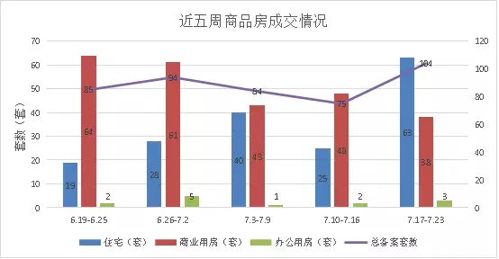 从两种物业来看,本周成交备案以住宅为主,占整体成交量的61%;商业本周成交套数为38套,较上周环比下降49.3%;办公市场一直低位运行,本周成交量为3套,较上周环比上升50%,主要是目前办公类产品供需均稀少。