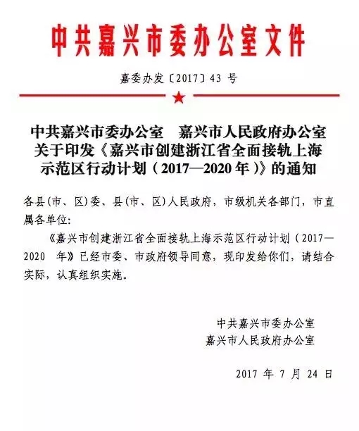 7月26日,中共嘉兴市委办公室、嘉兴市人民政府办公室关于印发《嘉兴市创建浙江省全面接轨上海示范区行动计划(2017—2020年)》的通知,创建浙江省全面接轨上海示范区,是嘉兴抢抓国家重大战略机遇的关键举措,是贯彻落实省委“八八战略”的重要抓手,也是服务上海建设“五个中心”的应势之举。为在更高水平、更深层次上接轨上海、融入长三角、服务全省工作大局,根据省第十四次党代会报告和省政府关于同意设立浙江省全面接轨上海示范区的批复精神,特制定本行动计划。
