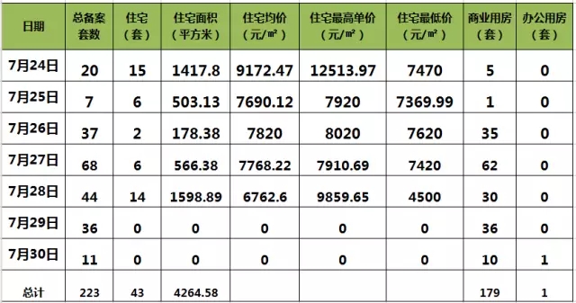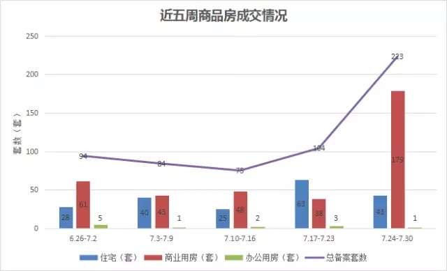 上周商品房备案总套数为223套,其中住宅43套,商业179套,办公1套;住宅备案均价7842.68元/㎡,备案***均价12513.97元/㎡,***4500元/㎡,从表格中我们可以看出本周商业成交套数明显高于住宅成交套数,这可能与新城吾悦广场的商铺出售有关。