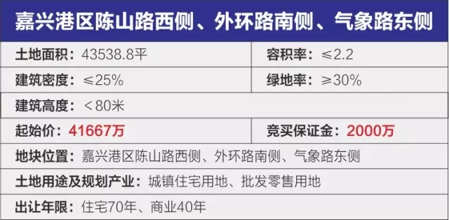 该地块位于嘉兴港区陈山路西侧、外环路南侧、气象路东侧,从地块信息来看,占地面积43538.8㎡,容积率≤2.2,绿化率≥30%。