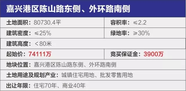 该地块位于嘉兴港区陈山路东侧、外环路南侧,占地面积约80730.4㎡,容积率≤2.2,绿地率≥30%。