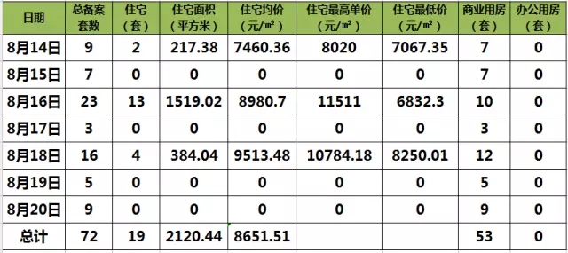 上周商品房备案总套数为72套,其中住宅19套,商业53套,办公0套;住宅备案均价8651.51元/㎡,备案***均价11511元/㎡,***6832.3元/㎡,从表格中我们可以看出本周住宅套数明显低于商业成交套数,这主要是因为近期新城吾悦广场商铺宣传有关。