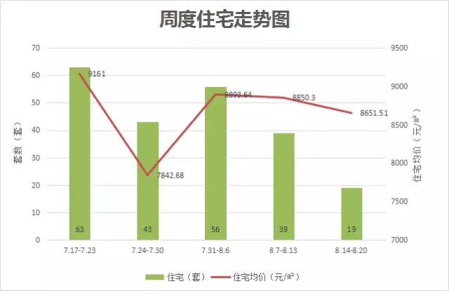 本周住宅共成交19套,较上周环比下降105.3%;备案均价8651.51元/平米,环比上周下降2.3%。