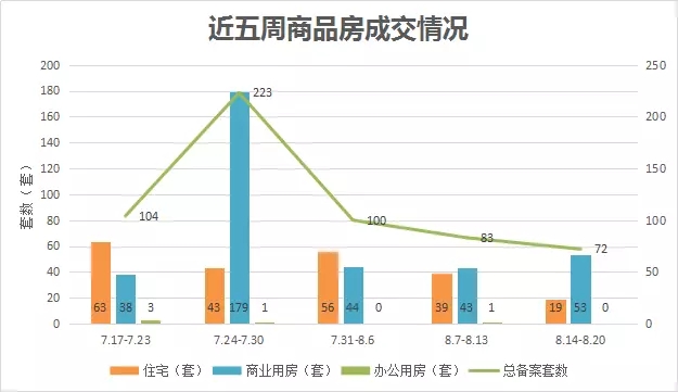 从两种物业来看,本周成交备案住宅相对多一点,占整体成交量的26%;商业本周成交套数为53套,较上周环比上升18.9%;办公市场一直低位运行,本周成交量为0套,较上周环比下降100%,主要是目前办公类产品供需均稀少。