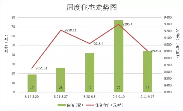 本周住宅共成交44套,较上周环比下降75%;备案均价8906.4元/平米,环比上周下降4.4%。