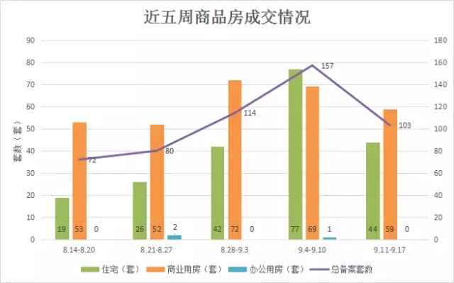 上周商品房备案总套数为103套,其中住宅44套,商业59套,办公0套;住宅备案均价8906.4元/㎡,备案***单价12421.5元/㎡,***6902.2元/㎡,从表格中我们可以看出本周住宅套数明显低于商业成交套数。