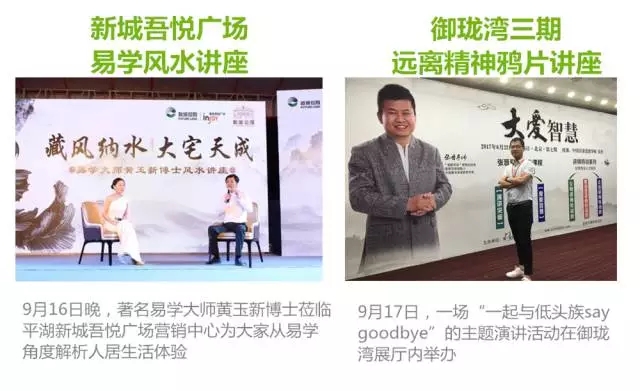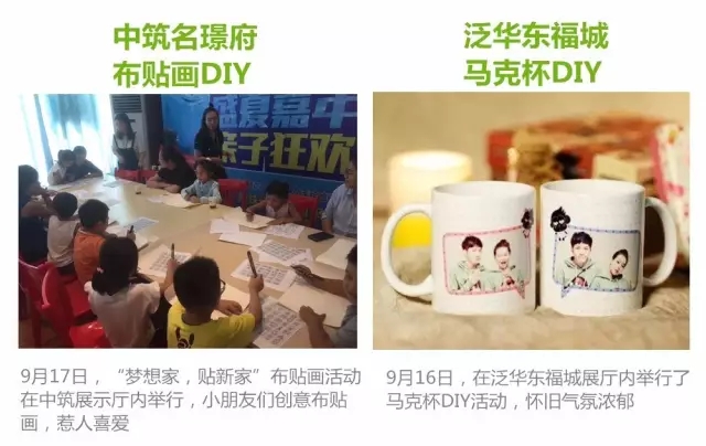 项目动态:泛华东福城马克杯DIY;中筑名璟府布贴画DIY;新城吾悦广场易学风水讲座;海德城商业街现铺特购会;御珑湾三期远离精神鸦片讲座;中梁壹号院预约抢号