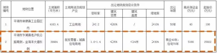 9月29日,平湖再次出让两宗地,其中一宗为工业用地,位于林埭镇工业园区;一宗为批发零售、城镇住宅用地,位于平湖市乍浦镇老沪杭公路南侧、金海洋大道东侧。该2地块现场竞价时间为2017年10月30日15:30时。