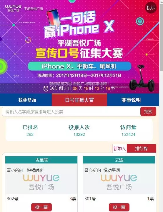 12月18-12月31日期间,新城吾悦广场征集宣传口号,要求贴近平湖吾悦广场,体现平湖吾悦广场理念与特色,风格不限。活动奖品丰富、参赛火爆,热情满满。