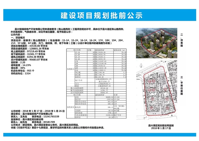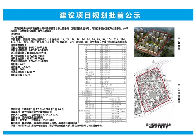 御景湾(陈山路西侧)位于嘉兴港区陈山路西侧、外环路南侧、气象路东侧,总建筑面积128801.26㎡,容积率2.20,绿化率30%。