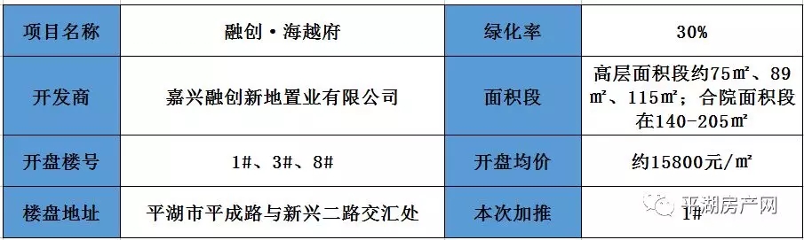 融创·海越府位于平湖市平成路与新兴二路交汇处,绿化率为30%,项目整体容积率2.0,项目主要以高层与合院组成,本次加推楼号为1#(20层),面积为75㎡、89㎡、115㎡,均价约15800元/㎡。