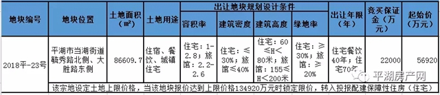本次挂牌地块位于平湖市当湖街道毓秀路北侧、大胜路东侧,占地面积86609.7㎡(居住用地61610㎡,旅馆用地25000㎡),土地用途为住宿餐饮、城镇住宅的综合体,容积率住宅:1-2.8;旅馆:2.2-2.6。绿地率:住宅:≥30%;旅馆:≥20%。竞拍起始价为56920万元。